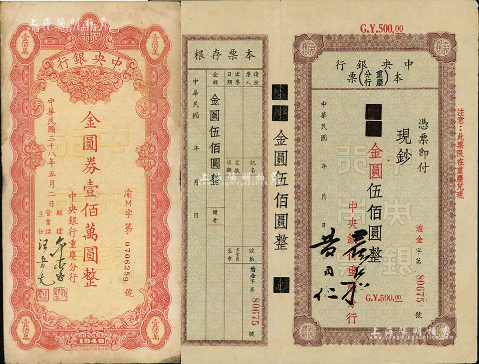 中央银行(重庆分行)本票无年份版国币改金圆伍佰圆、1949年金圆券壹佰万圆共2枚不同,七至九成新