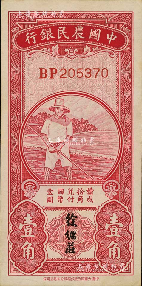 中国农民银行无年份版红色农夫图壹角,双字轨,徐继庄签名;台湾明德堂藏品,九成新