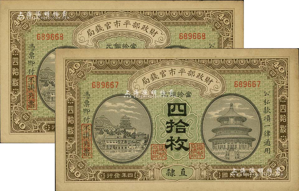 民国四年(1915年)财政部平市官钱局当拾铜元四拾枚共2枚,直隶地名;源于前辈藏家之遗存,九五成新