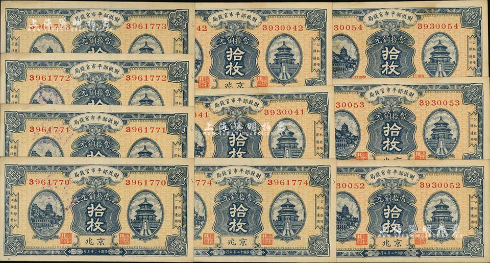 民国十二年(1923年)财政部平市官钱局当拾铜元拾枚共10枚,部分连号,京兆地名;源于前辈藏家之遗存,九五成新