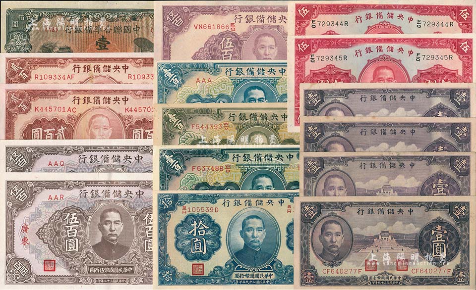 日伪纸币共16枚,详分:中央储备银行1940年紫壹圆4枚、伍圆2枚、拾圆,1942年壹百圆,1943年绿色壹百圆、蓝色壹百圆、长框无底纹伍百圆、“广东”地名伍百圆2枚,1944年贰百圆2枚;中国联合准备银行左楼阁右帝壹百圆;八五至九八成新,敬请预览