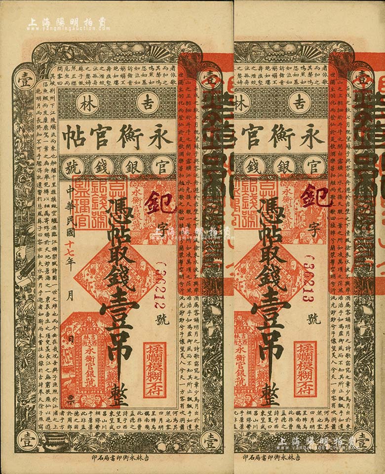 民国十七年(1928年)吉林永衡官帖壹吊共2枚连号,九五成新