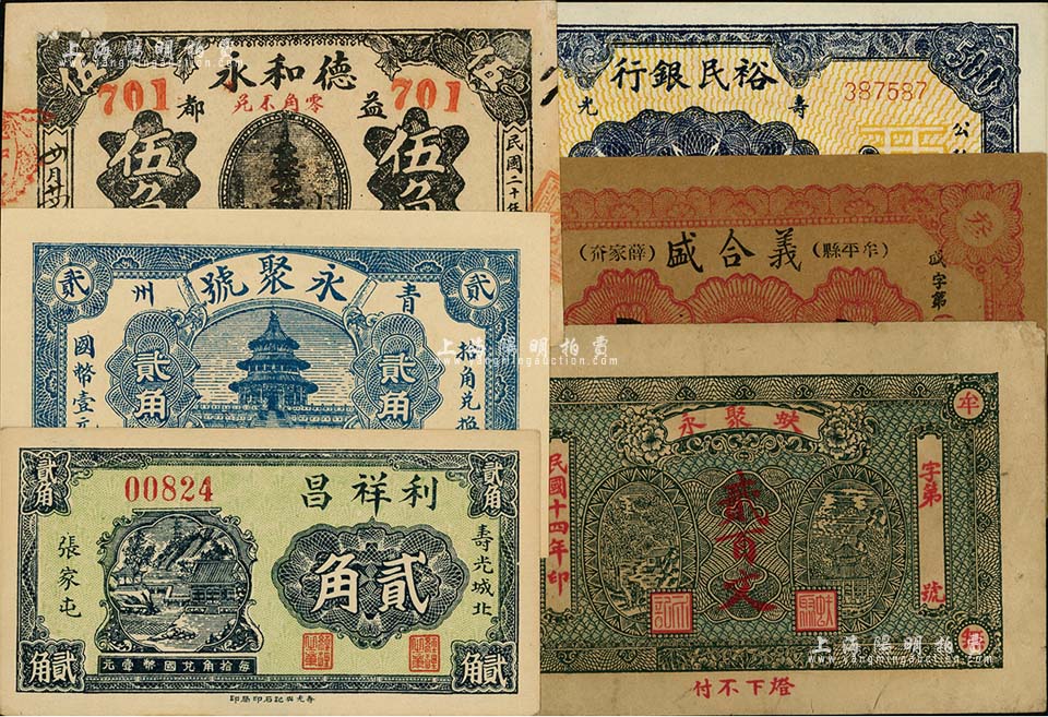 山东纸币6枚,详分:寿光裕民银行1944年伍百圆;(牟平)蚨聚永1925年贰百文、义合盛1938年叁角;(寿光)利祥昌贰角;(青州)永聚号贰角;(益都)德和永1931年伍角;海外回流品,七五至全新