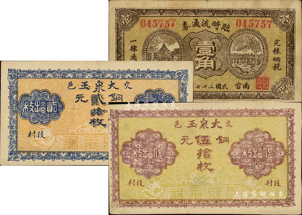 山西河北钱票3种,详分:(交邑)大泉玉1926年铜元贰拾枚、伍拾枚;南宫临时流通券1938年壹角;海外回流品,八至九五成新