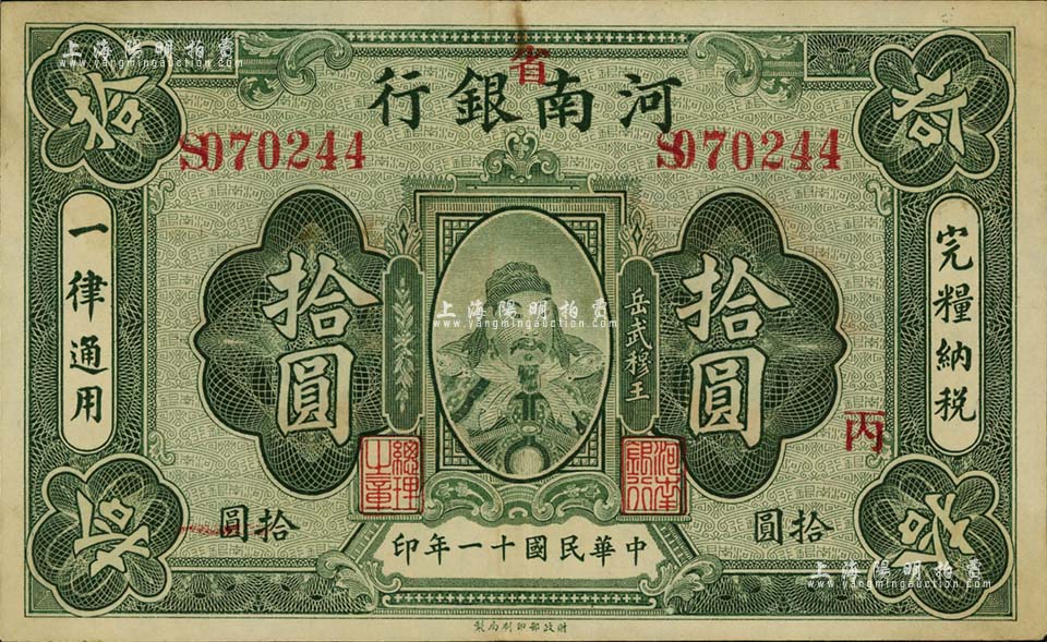 民国十一年(1922年)河南银行拾圆,加“省”字,上印武穆王岳飞像,海外回流品,八至八五成新