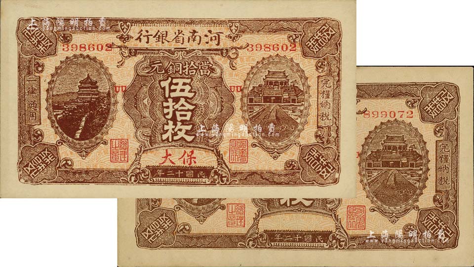 民国十二年(1923年)河南省银行当拾铜元伍拾枚,保大地名,属少见版式,九八成新(另附:河南省银行1923年伍拾枚无地名券1枚,以供对照!)