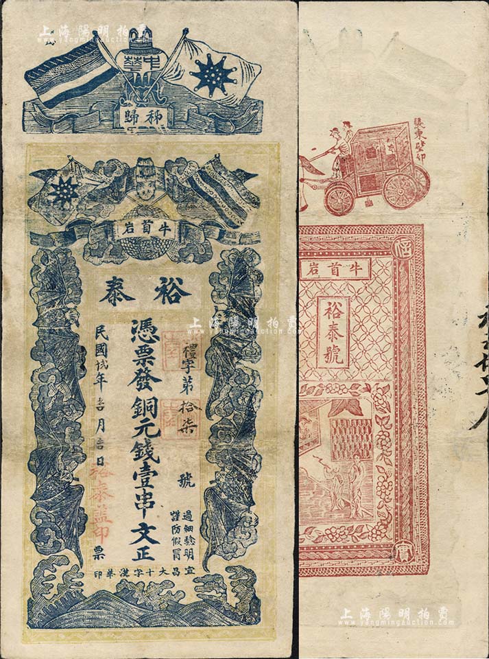 民国贰十年(1931年)裕泰·凭票发铜元钱壹串文,湖北秭归县钱庄钞票,上印五色旗、铁血十八星旗和五蝠临门图,背印马车图等,罕见,有修补,七五成新