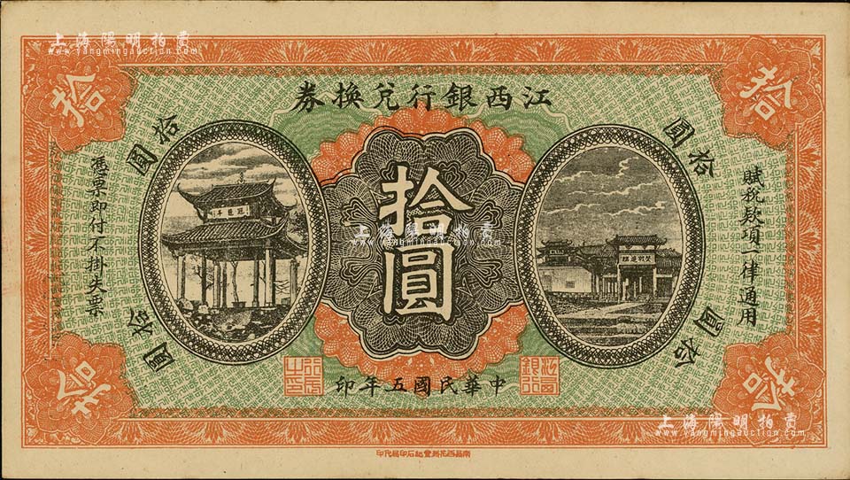 民国五年(1916年)江西银行兑换券拾圆,滕王阁图,南昌印制;台湾藏家出品,九五成新