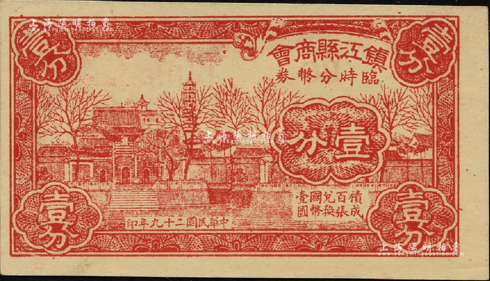 民国二十九年(1940)镇江县商会临时分币券壹分,上印金山寺风景;资深藏家出品,源于著名集钞家柏文先生之旧藏,且为《百草集》第642页之图片原物,全新