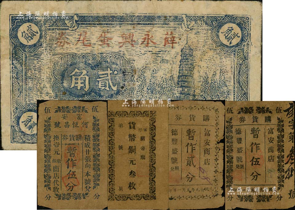 抗战时期江苏东台县民间钞票5种,详分:(富安)何恒昌购货券暂作伍分;富安商店·购货券1940年暂作贰分、伍分,由德丰盛号照兑;(五圩关帝庙)货币铜元叁枚;薛永兴蛋尾券贰角,上印古塔,背印帆船图;江南藏家出品,六至七五成新