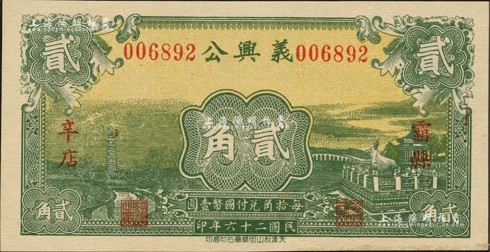 民国二十六年(1937年)义兴公贰角,河北霸县民间钞票,上印龙华寺塔和颐和园铜牛图;森本勇先生藏品,源于美国著名集钞家Ward D. Smith(史密斯)之旧藏,且为其著作1970年英文版《中国纸币》第122页之图片原物,罕见,九五成新