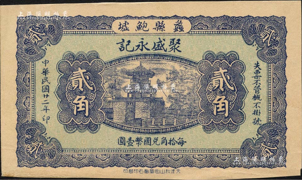 民国廿二年(1933年)聚盛永记贰角,河北蠡县民间钞票,上印古城楼,背印大明湖北极庙;森本勇先生藏品,九成新