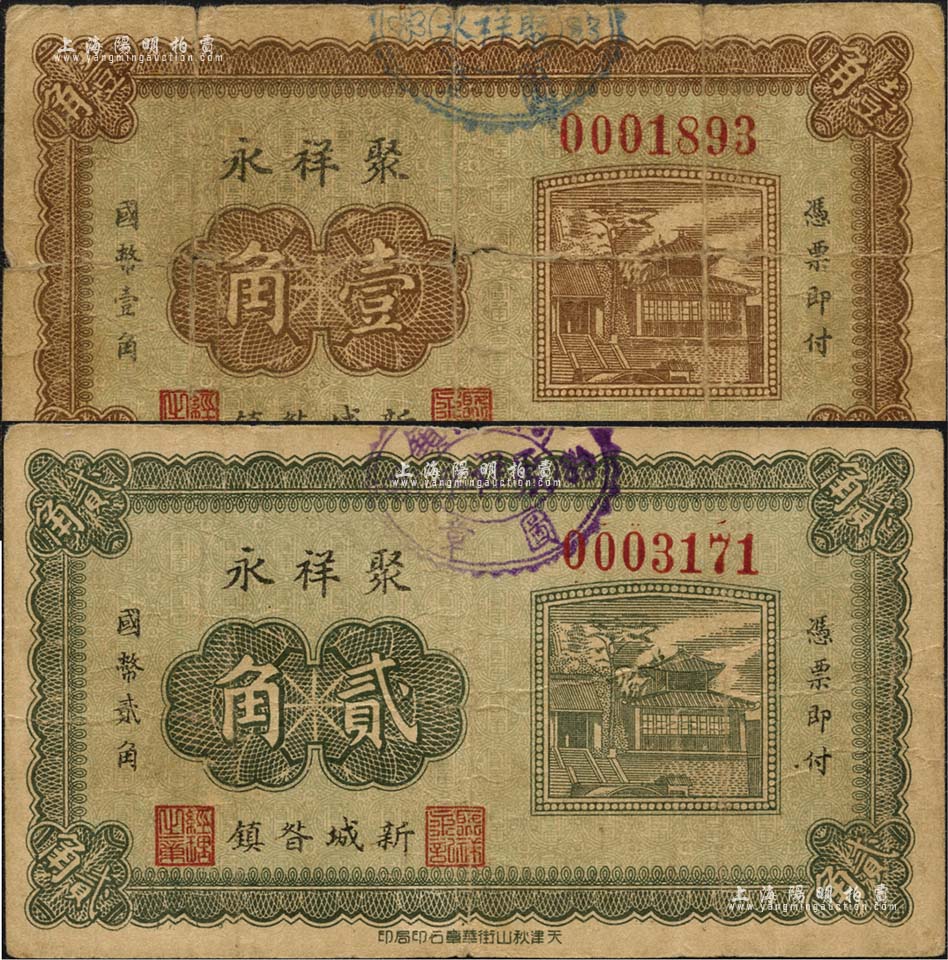 聚祥永无年份版壹角、贰角共2枚不同,河北新城县民间钞票,上印大明湖北极庙,背印颐和园铜牛图;森本勇先生藏品,七至八成新