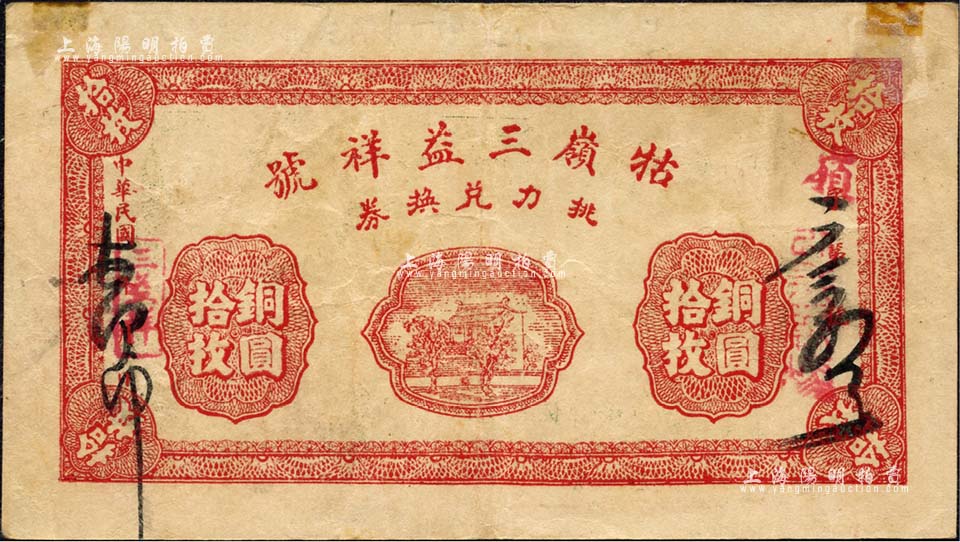 民国十四年(1925年)牯岭三益祥号挑力兑换券铜圆拾枚,背印聚宝盆图,亦可在九江兑换;森本勇先生藏品,上有贴痕,近八成新