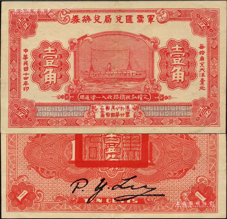 民国十四年(1925年)军需汇兑局兑换券壹角,由直系军阀吴佩孚之讨贼联军总司令部发行于汉口等地;森本勇先生藏品,九成新