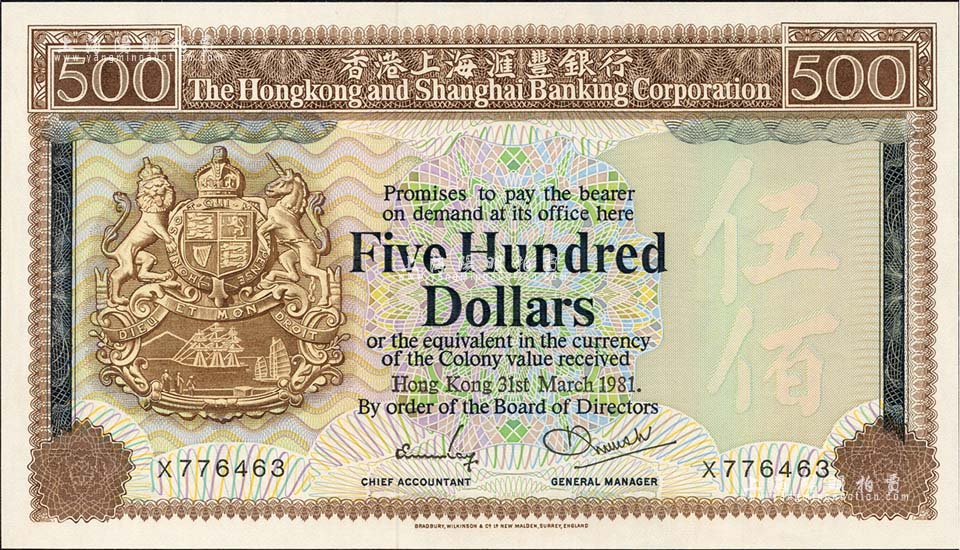 1981年香港上海汇丰银行伍佰圆,香港地名,海外藏家出品,全新