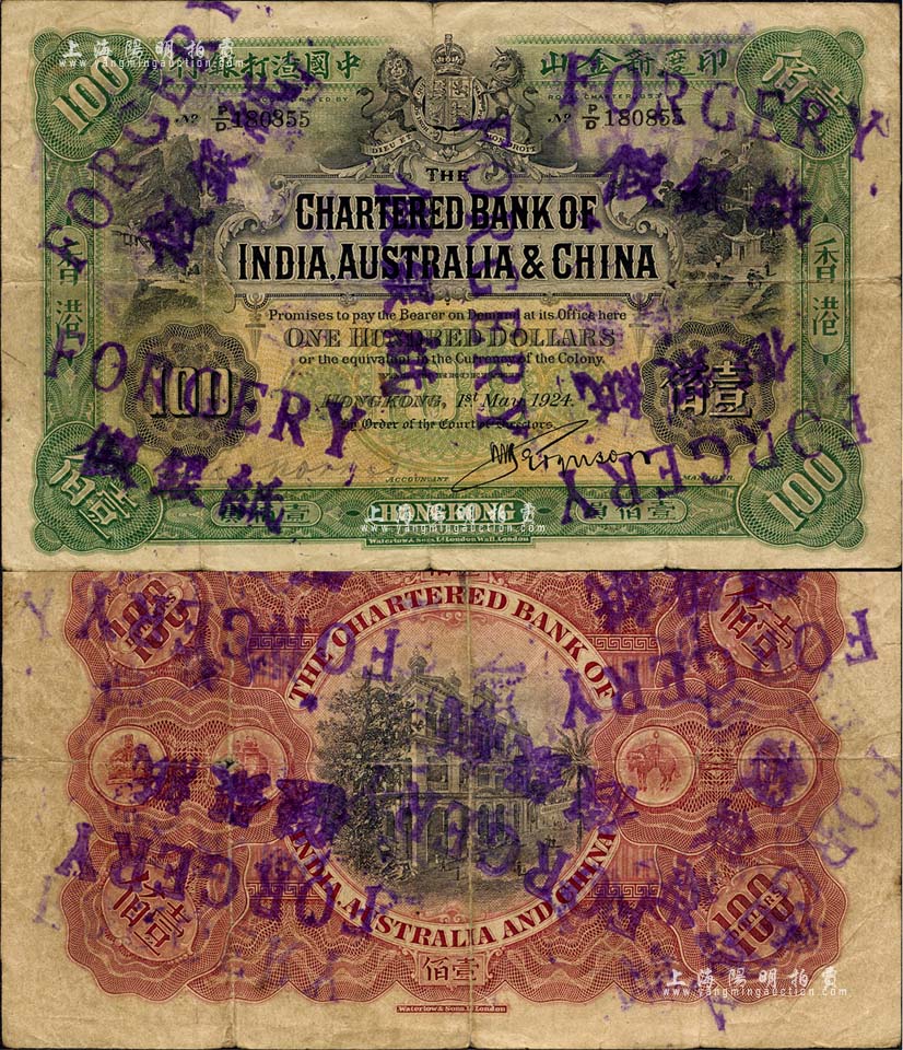 1924年印度新金山中国渣打银行壹佰员,香港地名,乃属历史同时期之老假票;海外藏家出品,七五成新