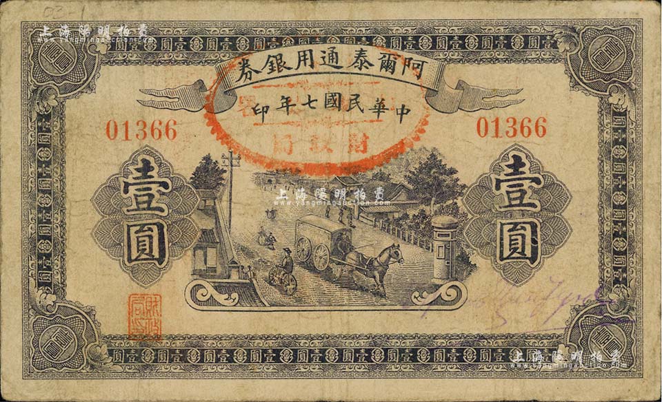 民国七年(1918年)阿尔泰通用银券壹圆,新疆特区纸币,七五成新