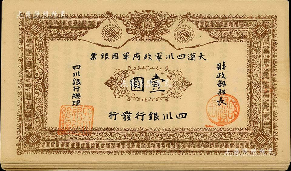 黄帝纪元四千六百有九年(1911年)大汉四川军政府军用银票壹圆共30枚,四川银行发行,均属历史同时期之老假票),未折九至九五成新