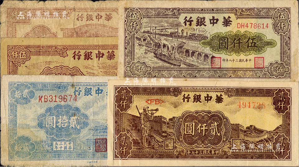华中银行纸币5种,详分:1946年蓝天坛贰拾圆,1947年牛耕田壹仟圆,1948年长城吹号图贰仟圆,1949年码头船图伍仟圆、棕色矿山图伍仟圆;江南藏家出品,七至八成新