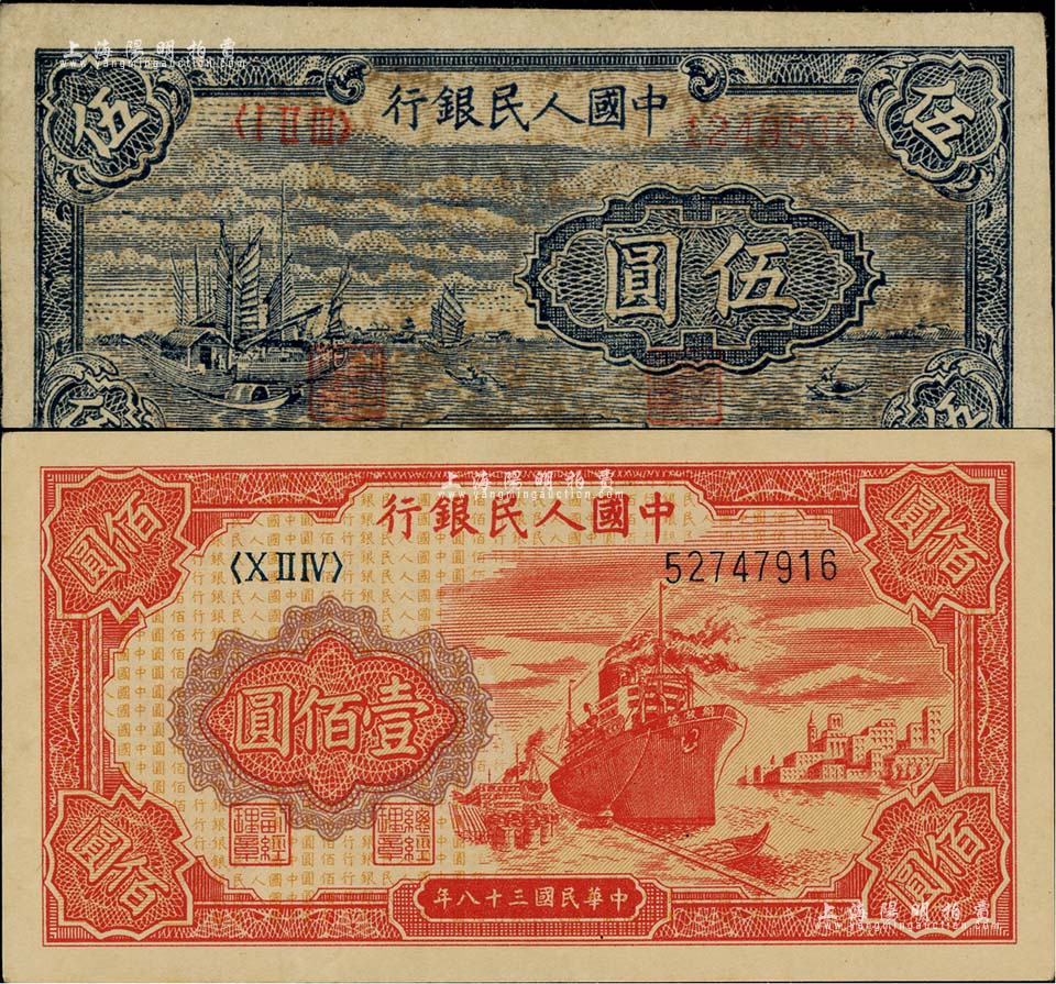 第一版人民币“帆船图”伍圆、“红轮船”壹佰圆共2枚不同,台湾藏家出品,八至九成新
