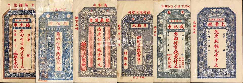 文登县钱票6种,详分:德生东市钱壹仟文、德仁堂市钱壹仟文、敬义药室市钱壹仟文、日德永市钱壹吊、盛记东市钱壹仟文、元丰栈铜元壹千文;森本勇先生藏品,且均为森本勇、蔡小军编著《山东民间钞票》一书之图片原物,七至九五成新