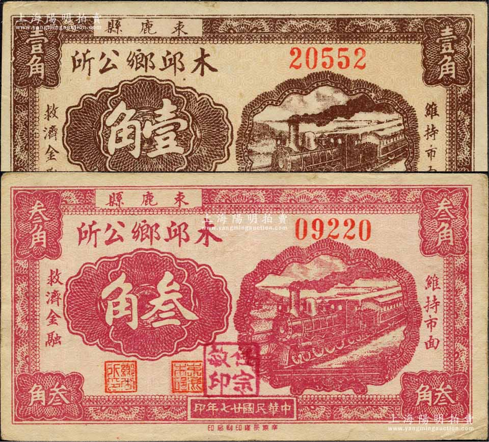 民国廿七年(1938年)束鹿县木邱乡公所壹角、叁角共2枚不同,其背面告白文字中均言及“七七事变”等情,极富时代之见证;森本勇先生藏品,八五成新