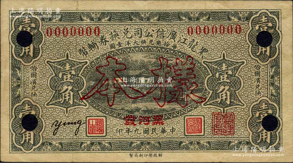 民国九年(1920年)黑龙江广信公司兑换券辅币壹角样本券,加盖“黑河发”地名,背面印有蒙文;森本勇先生藏品,少见,八成新