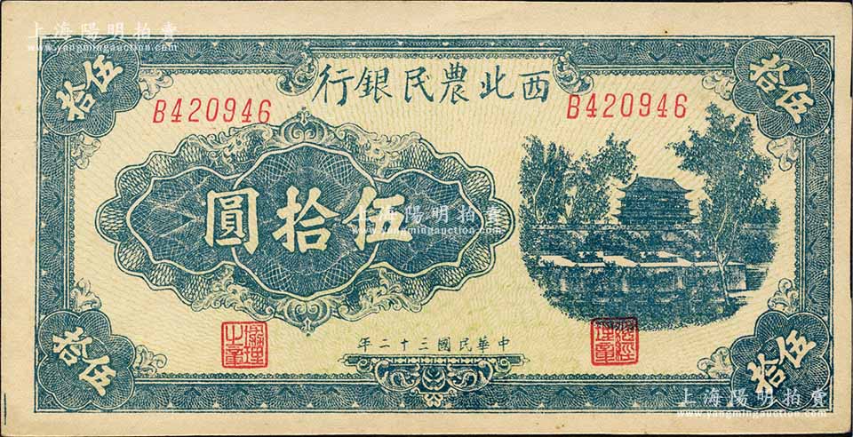 民国三十二年(1943年)西北农民银行蓝色城楼图伍拾圆,斜体号码6位数券;森本勇先生藏品,九八成新