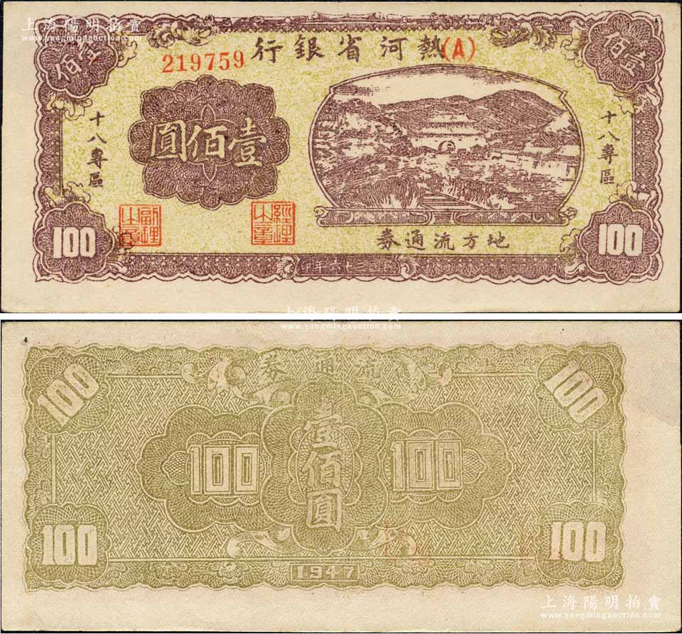 民国三十六年(1947年)热河省银行地方流通券山边城楼图壹佰圆,加印“十八专区”字样;森本勇先生藏品,罕见,九成新