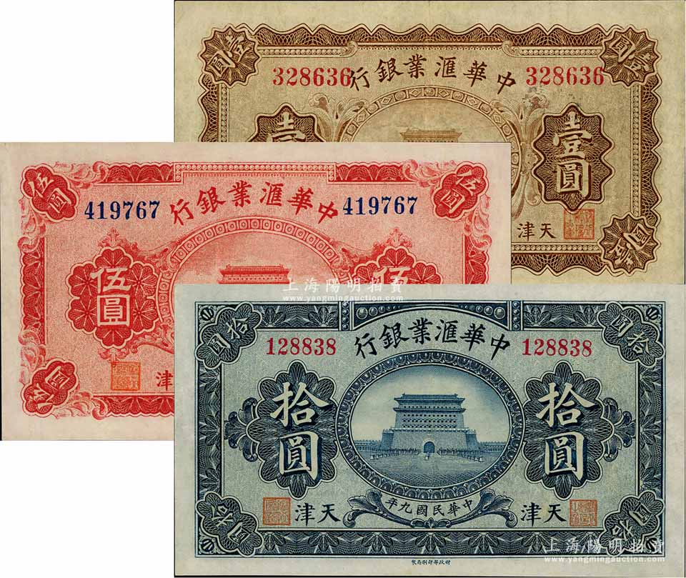 民国九年(1920年)中华汇业银行壹圆、伍圆、拾圆共3枚不同,天津地名,八至九五成新