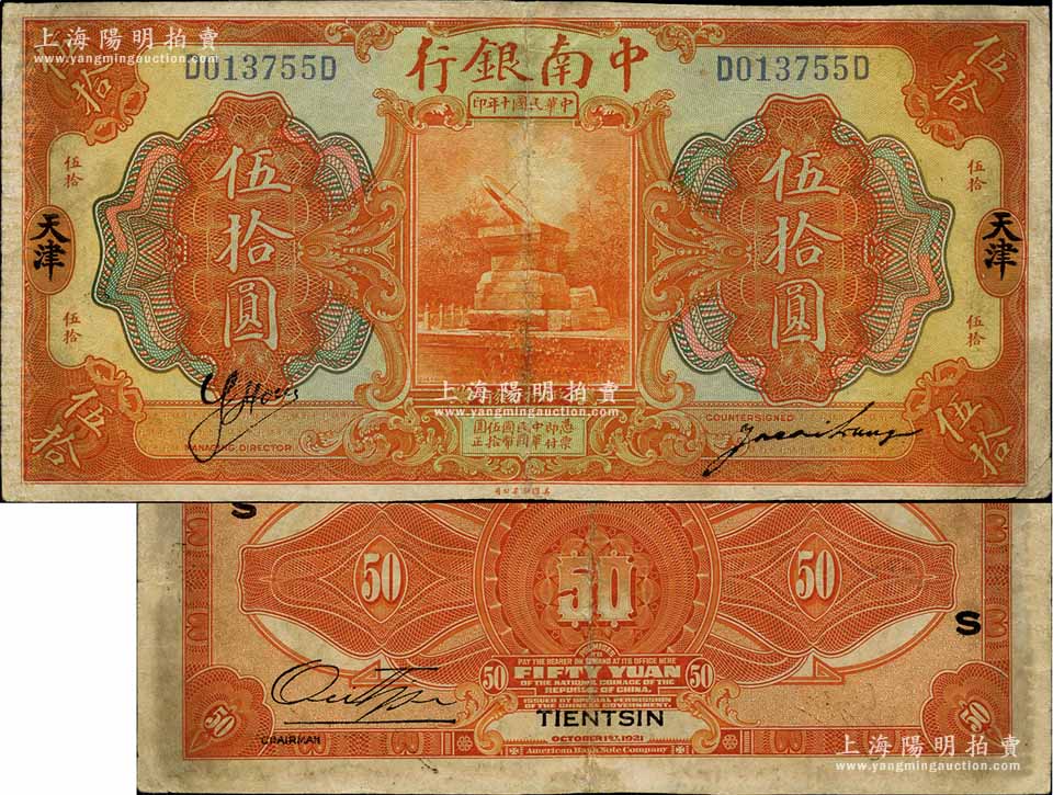 民国十年(1921年)中南银行伍拾圆,天津地名,背印领券“S”字;海外藏家出品,此种大面额券存世稀见,微有小修,近八成新