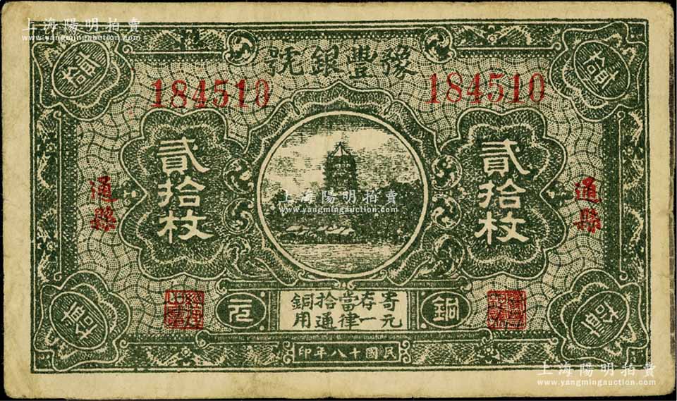 民国十八年(1929年)豫丰银号铜元贰拾枚,通县地名,上印杭州六和塔;白尔文先生藏品,八成新