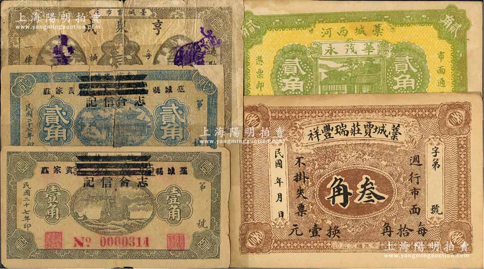 藁城县纸币5种,详分:藁城贾庄瑞丰祥叁角,亨聚成1931年壹角,志合信记1938年壹角、贰角、华茂永1939年贰角;白尔文先生藏品,其中1枚有缺损及贴补,五至九成新