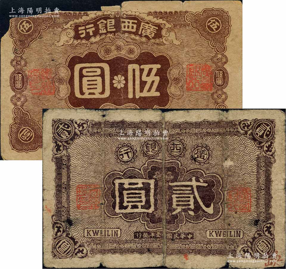 民国拾壹年(1922年)广西银行贰圆、伍圆共2枚不同,背印广西临时总司令部布告,或属军阀沈鸿英氏发行于桂林;白尔文先生藏品,有破损及贴补,五至六成新