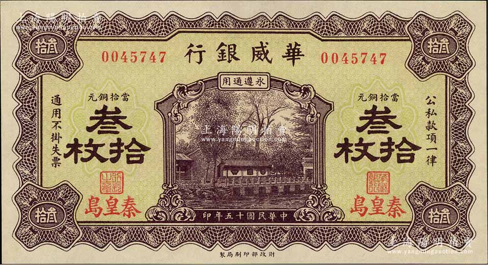 民国十五年(1926年)华威银行当拾铜元叁拾枚,秦皇岛地名,永遵通用,全新