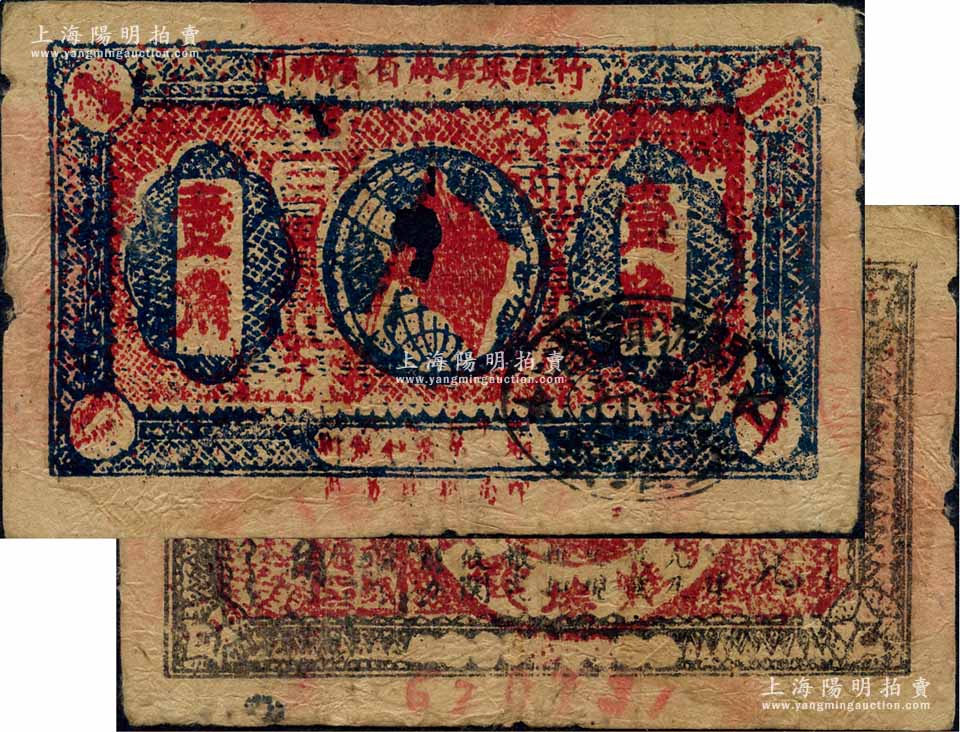 1933年闽浙赣省苏维埃银行壹角,正面椭圆形印章为黑色版,背印红色底纹版,版式、色泽与上券不同;江南藏家出品,中有破损,近六成新