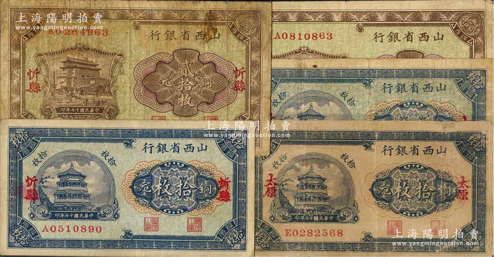 民国十七年(1928年)山西省银行铜元券5枚,详分:忻县地名拾枚、贰拾枚,太原地名拾枚2张、贰拾枚,其中忻县地名券较为少见;源于徐枫先生旧藏,其中1枚边有缺损,六至八成新