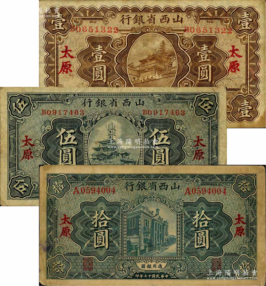 民国十七年(1928年)山西省银行显通寺铜殿图壹圆、钟楼图伍圆、行楼图拾圆共3枚全套,太原地名;源于徐枫先生旧藏,七至八成新