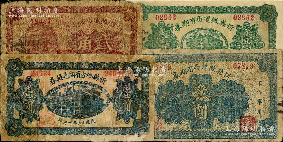 忻县纸币4种,详分:忻县地方有期兑换券1927年壹圆,忻县征运局有期券1928年叁角、壹圆、贰圆,均上印“不作军用”字样;源于徐枫先生旧藏,五至六成新