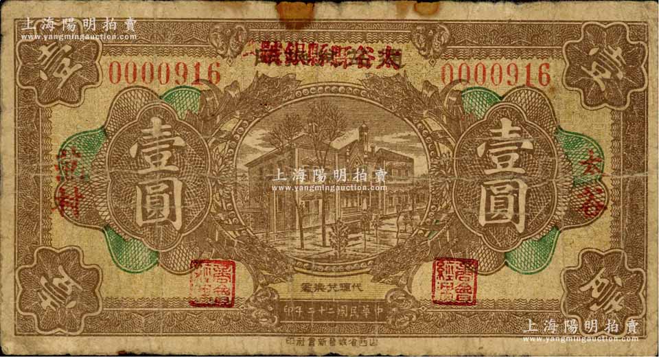 民国二十二年(1933年)通益兑换所改太谷县县银号壹圆,“太谷·范村”地名;源于徐枫先生旧藏,罕见,七成新