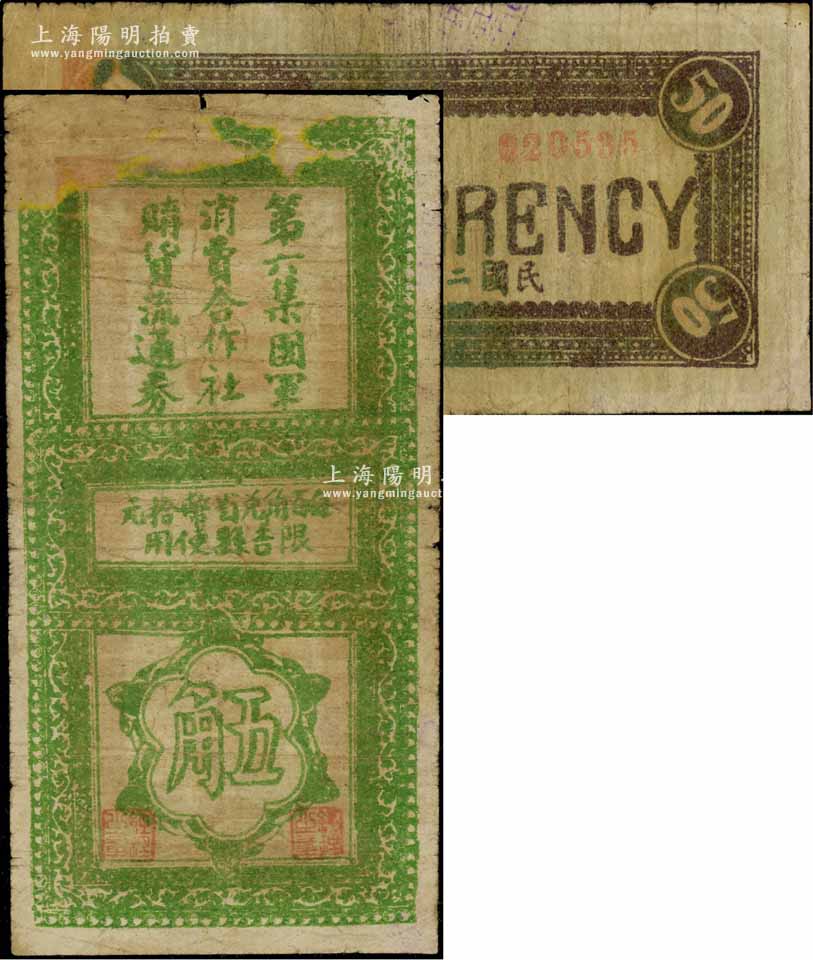 民国二十六年(1937年)第六集团军消费合作社购货流通券五角,限吉县使用,未见图谱记载,少见品,七成新