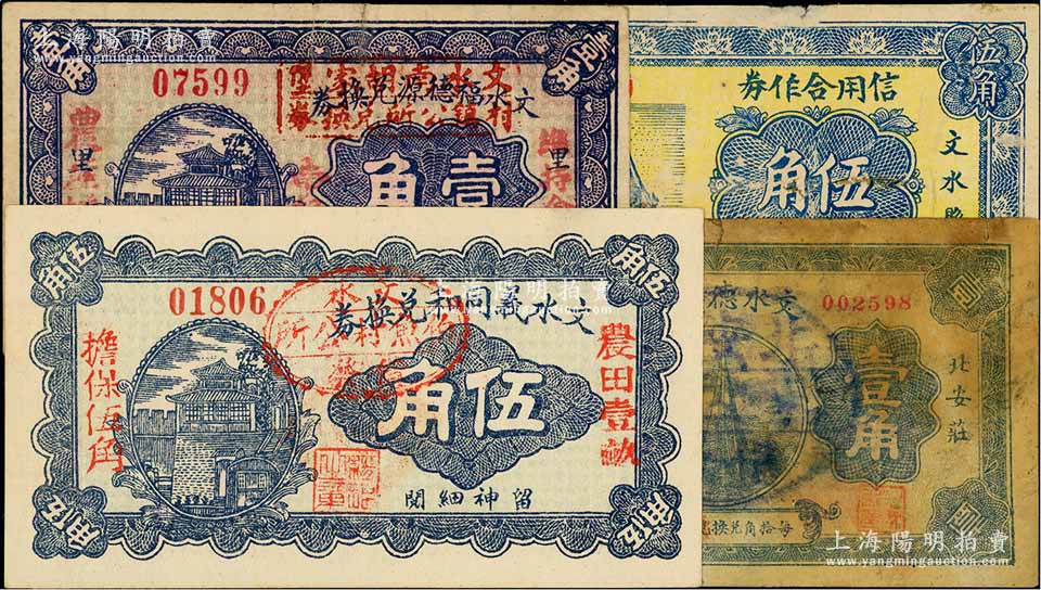 文水县纸币4种,详分:文水义同和兑换券1926年伍角,上盖“文水伯鱼村公所借发”戳记;文水福德源兑换券1927年壹角,上盖“文水南胡家堡村镇公所兑换券”戳记;文水德发和1932年壹角,上盖“北安庄村公所借发”戳记;(文水县北武劳村)信用合作券1937年伍角;七至九八成新