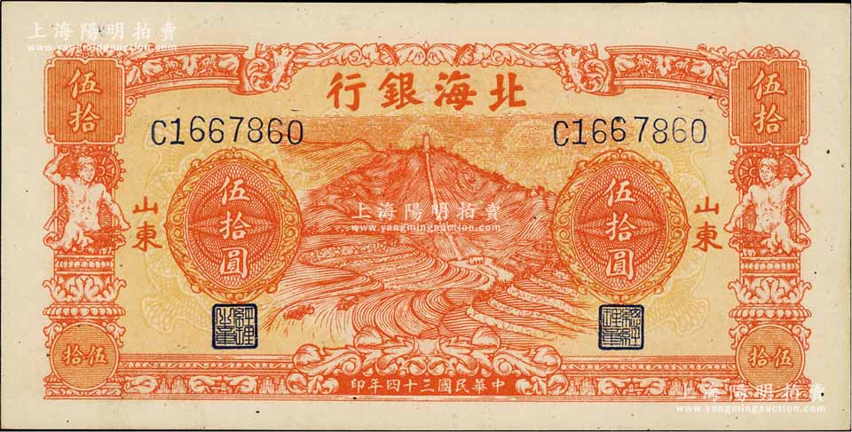 民国三十四年(1945年)北海银行桔色山景梯田图伍拾圆,山东地名;淄博李林先生藏品,未折九五成新