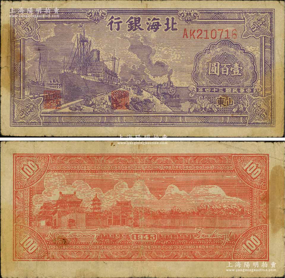 民国三十四年(1945年)北海银行紫色轮船火车图壹百圆,山东地名,背印英文口号“New democracy Free China”(即“新民主自由中国”);淄博李林先生藏品,少见,七五成新