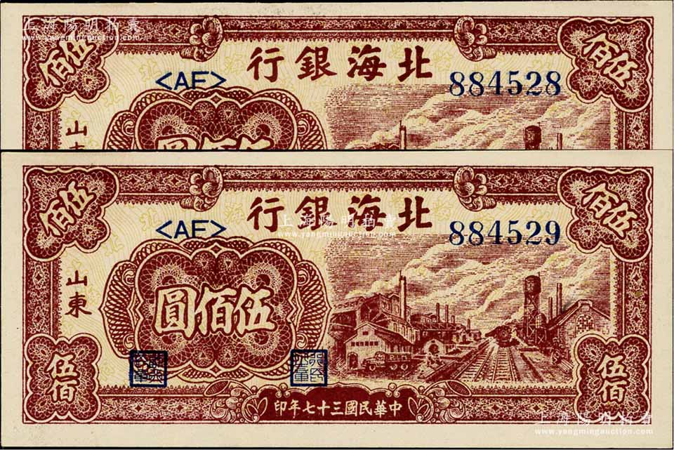 民国三十七年(1948年)北海银行棕红色工厂铁路图伍佰圆共2枚连号,山东地名;淄博李林先生藏品,全新