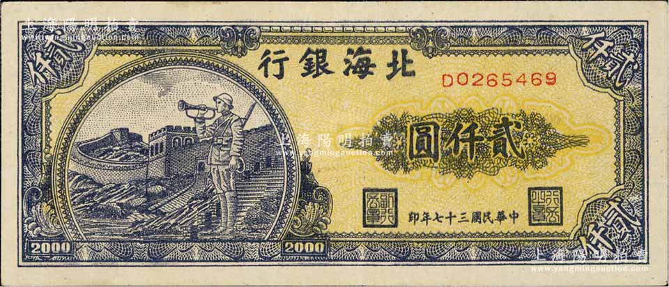 民国三十七年(1948年)北海银行长城吹号图贰仟圆,淄博李林先生藏品,九至九五成新