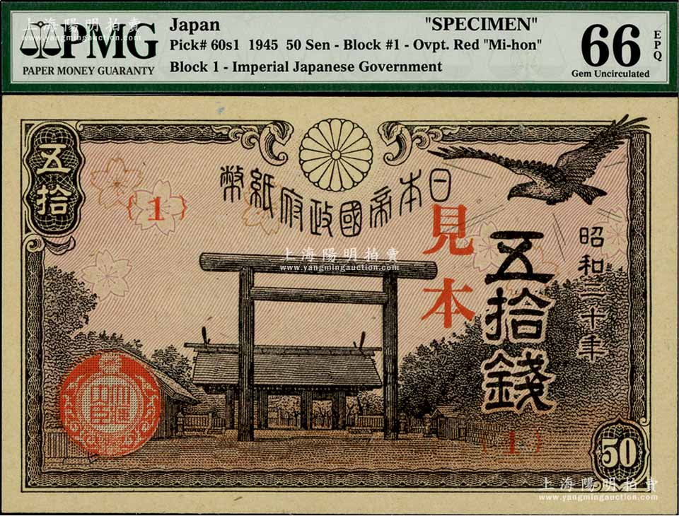 昭和二十年(1945年)日本帝国政府纸币五拾钱见本(即样本券),海外藏家出品,全新