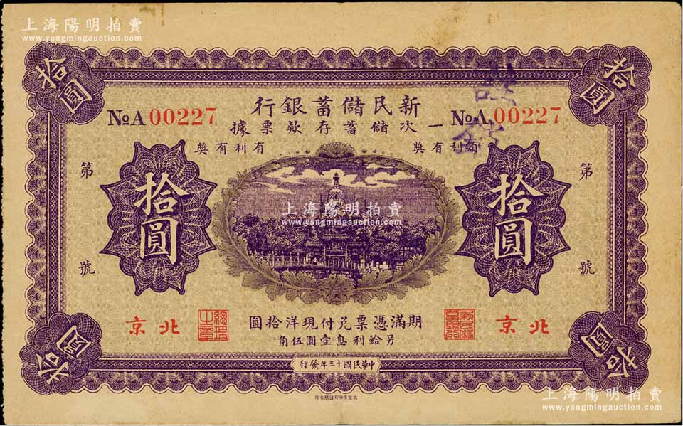 民国十三年(1924年)新民储蓄银行拾圆,北京地名,近八成新