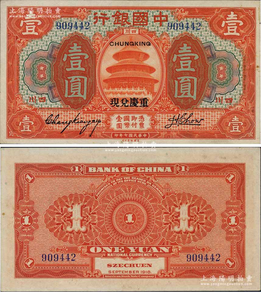 民国七年(1918年)中国银行桔色壹圆,四川地名,加盖“重庆兑现”字样,张嘉璈·周询签名;资深藏家出品,罕见且品相难得,未折九五成新